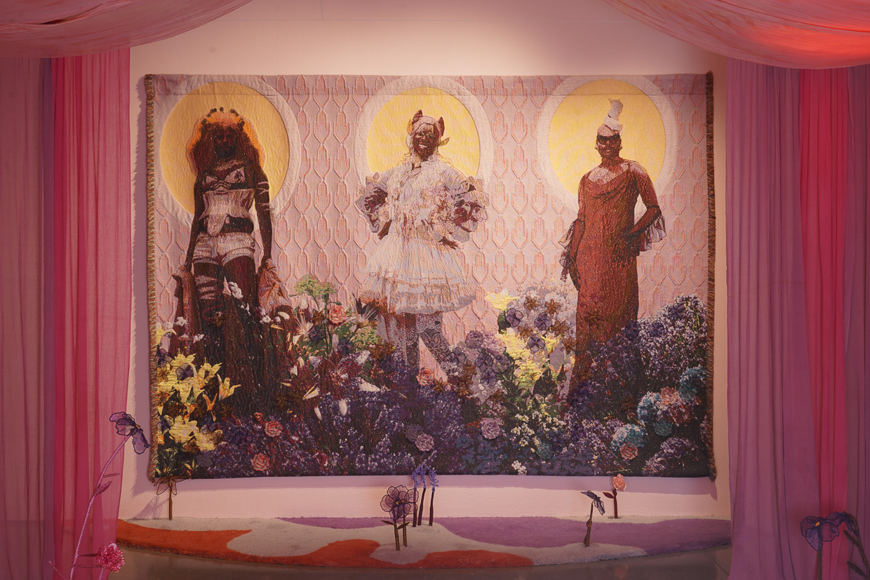 Meteen bij binnenkomst valt het wandkleed “It takes a village” van Yamuna Forzani op. Voor dit werk, gemaakt in samenwerking met het TextielLab van het TextielMuseum, gebruikte de kunstenaar de 3D double jersey jacquard brei-techniek met biologische katoen, acryl en gerecyclede viscose. Het kleed toont een kleurrijke queer gemeenschap en benadrukt de waarde van gekozen familie en onderlinge solidariteit. Forzani gebruikt textiel als medium om verbinding, inclusiviteit en queer identiteit te verbeelden.