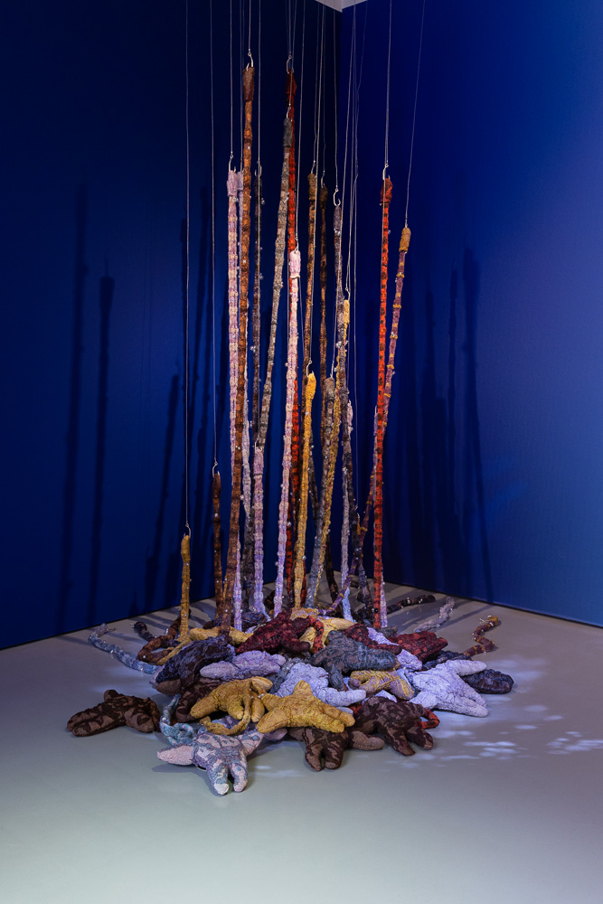 Ook anderen spreken via draad en vezel. Walter Van Beirendonck laat in zijn vloerkleed “Silent Secrets”, opgebouwd uit zelfportretten, zijn binnenwereld zien: draden als zinnen, steken als ademhaling. Zijn werk laat voelen hoe kwetsbaarheid en kracht in hetzelfde weefsel kunnen bestaan. Ada Maricia Patterson breidt in “Might this dead end be livable?” het leven uit tot iets dat oceaan en mens verbindt: een netwerk van gebreide zeesterren die verwijzen naar regeneratie en veerkracht, maar ook naar gemeenschap en ecologische kwetsbaarheid. Zo weeft ze transzijn en queer identiteit samen met de ritmes van de aarde – in een ademende installatie van draad en licht.