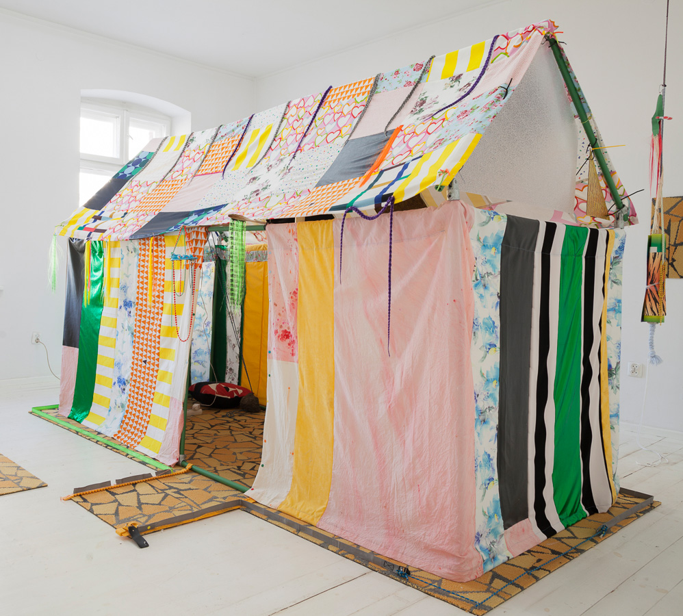 Vier kunstenaars – Nixie van Laere, Célio Braga, Chathuri Nissansala en Yamuna Forzani – maakten samen met het museum dit huis van vezels. Elk van hen werkt met textiel als gereedschap én als stem. In hun handen blijkt draad niet zomaar materiaal, maar drager van ervaringen. De naden, de steken, het trekken van de draad – alles herinnert aan aanraking, aan maken, aan geduld.