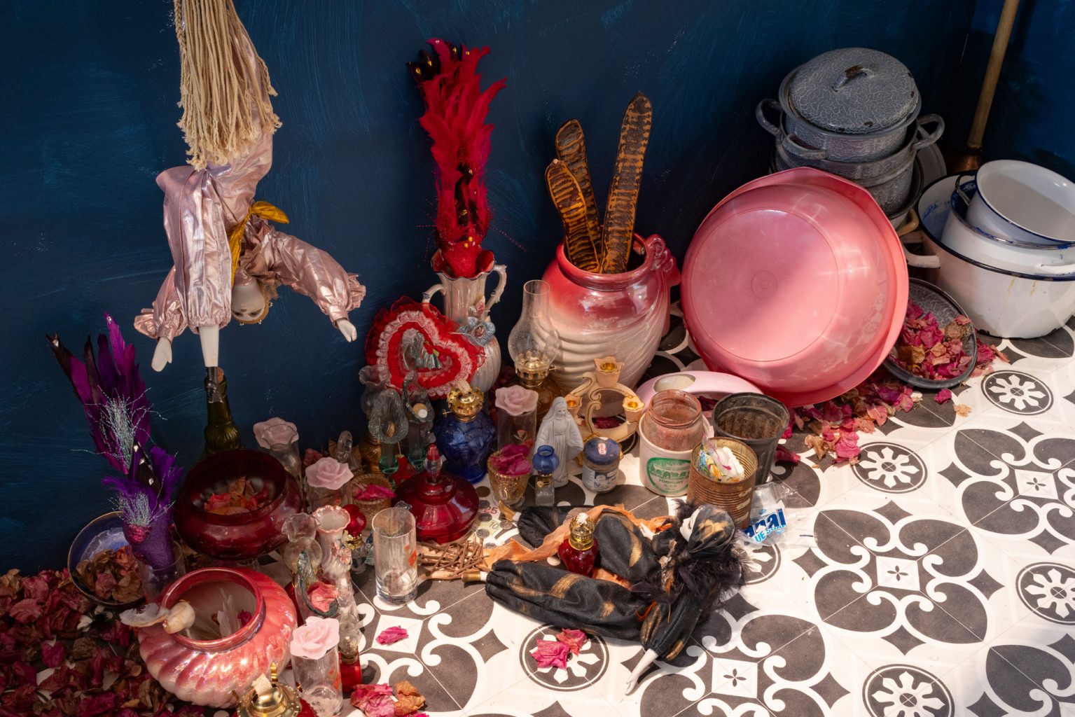 Om bij het hart van ‘Lusgarda’ te komen, passeert de bezoeker een doorgangsruimte met een bonte verzameling gebruiksvoorwerpen, zoals te vinden in eenvoudige woningen, niet alleen in het Caribisch gebied maar in heel Latijns-Amerika. Een oude slingercentrifuge, een tweepits gaskookplaat, potten, pannen, een transistorradio en talloze bedrukte lappen stof. Er zijn ook religieuze voorwerpen en afbeeldingen, met katholieke en Afro-Caribische connotaties, die in hun verbondenheid en tegenstellingen voorbeelden vormen van syncretisme. Er hangt een geur van zeep en geurwater. Al deze elementen vormen samen een tastbaar archief van het alledaagse; ze ademen sporen van een leven dat tegelijk kwetsbaar en veerkrachtig is.